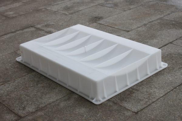 其中,流水石蓋板模具多加強筋設計,在模具全框架邊布置小型高密度加強筋,在流水石蓋板模具底部則布置大型月牙型加強筋,可以有效的保證在預制水泥流水石蓋板過程中,模具和水泥成品均不會變形。
