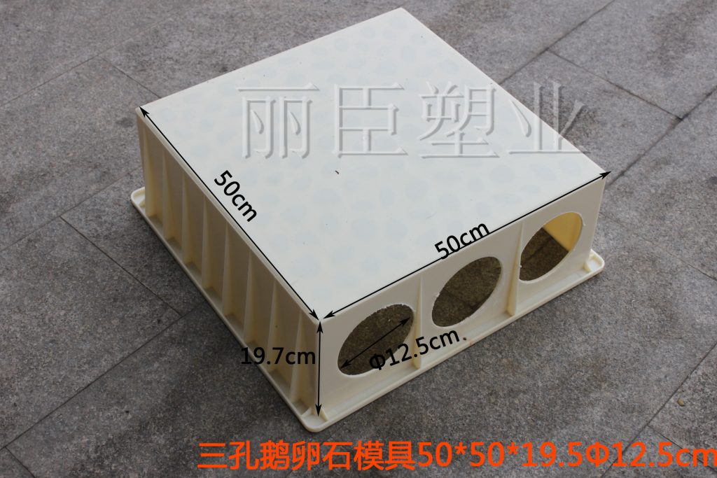 其中泄水管線纜槽模具整體外觀為正方形結構,長款分別是50厘米,高度為19.5厘米,六個貫通圓孔單一直徑為12.5厘米,具體細節指標及樣式請參考下圖。