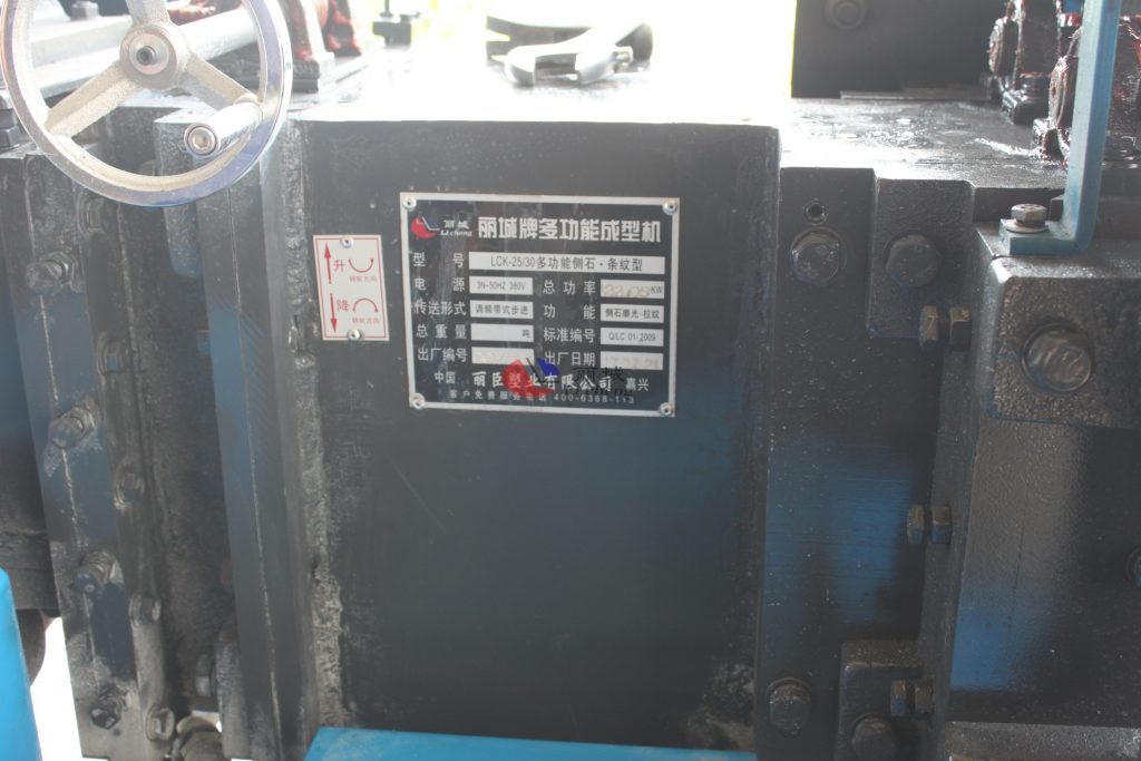 這款LCK-25/30多功能側(cè)石二工位條紋成型機(jī),其主要功能是對澆筑成型的水泥模具進(jìn)行二次加工成型,其機(jī)器總功率為22.05KW,其傳送形式為調(diào)頻帶式步進(jìn),電源使用的標(biāo)準(zhǔn)為3N-50HZ 380V。
