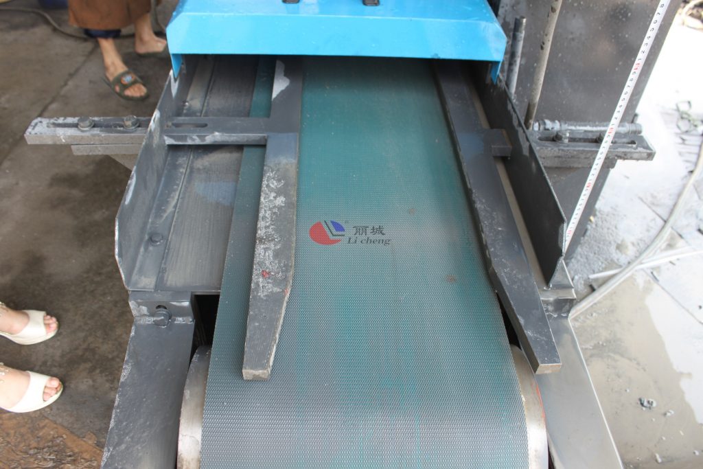 制作這臺多功能成型機(jī)的技術(shù)員在對這臺機(jī)器出廠前進(jìn)行了最后一步的調(diào)試,將澆筑成型的水泥磚放置輸送帶上,成型機(jī)入口處與出口處都有配置供水系統(tǒng),防止在制作過程中塵土飛揚(yáng),能對水泥制品打磨過程中其表面更為整潔統(tǒng)一。經(jīng)過平磨系統(tǒng)對水泥模具澆筑成型的水泥制品進(jìn)行磨形,后進(jìn)入第二系統(tǒng)對水泥磚塊制品就進(jìn)行拉條紋,這款多功能側(cè)石二工位條紋成型機(jī)打磨成型的條紋彩磚的外觀以34條紋為主。打磨成型后在有輸送帶將水泥磚運(yùn)輸出來。其使用過程中為防止施工過程中的安全事故的發(fā)生,通過使用電控箱的方式來對機(jī)器進(jìn)行急??刂啤?br />