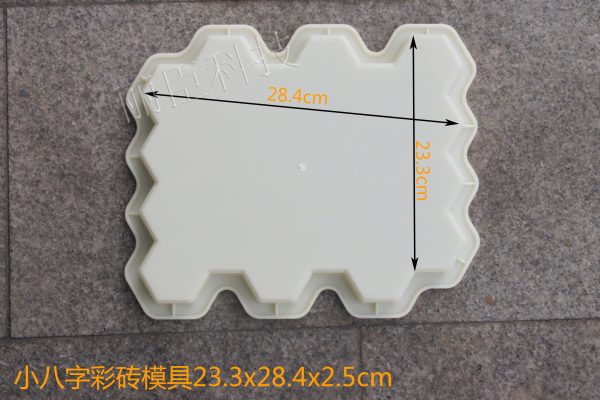 這款小八字彩磚塑料模具外觀上呈現(xiàn)出不規(guī)則形狀,遠(yuǎn)處看過去外觀有些像蜂巢的樣式,彩磚模具的規(guī)格為28.4×23.3×2.5,彩磚塑料模盒在制作過程中采用全新的ABS為主要生產(chǎn)原料,至成型后的彩磚塑料模具外觀整體呈現(xiàn)一種淡鵝黃色,其模具表面能有明顯的光澤感,下面這張圖是小八字彩磚模具澆筑成型后的模型款式。