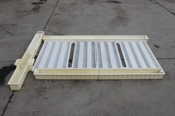 護欄欄片模具在高速路基護欄模具里面設置了4片式設計,水泥欄片成型為4+3+3+4的組合模具,尺寸分別為149.5*81*9cm2片,149.5*59*9cm2片。在使用整個路基護欄模具澆筑水泥制品過程中,水泥欄片模具為使用率相對較高的模具,采用PP聚丙烯原料更好的韌性可以更好的提高模具的使用次數。